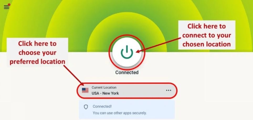 Todo está listo para ti. ExpressVPN elige una ubicación inteligente para usted en piloto automático. Para establecer una conexión rápida con un servidor VPN, haga clic en el botón de conexión. Haga clic en el botón “Ubicación actual” para conectarse a un servidor diferente.