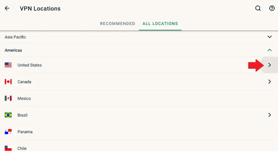 Seleccione el país deseado para establecer una conexión utilizando el servidor recomendado por ExpressVPN para esa región. Para ver otros servidores para una región determinada, presione el ícono del extremo derecho.