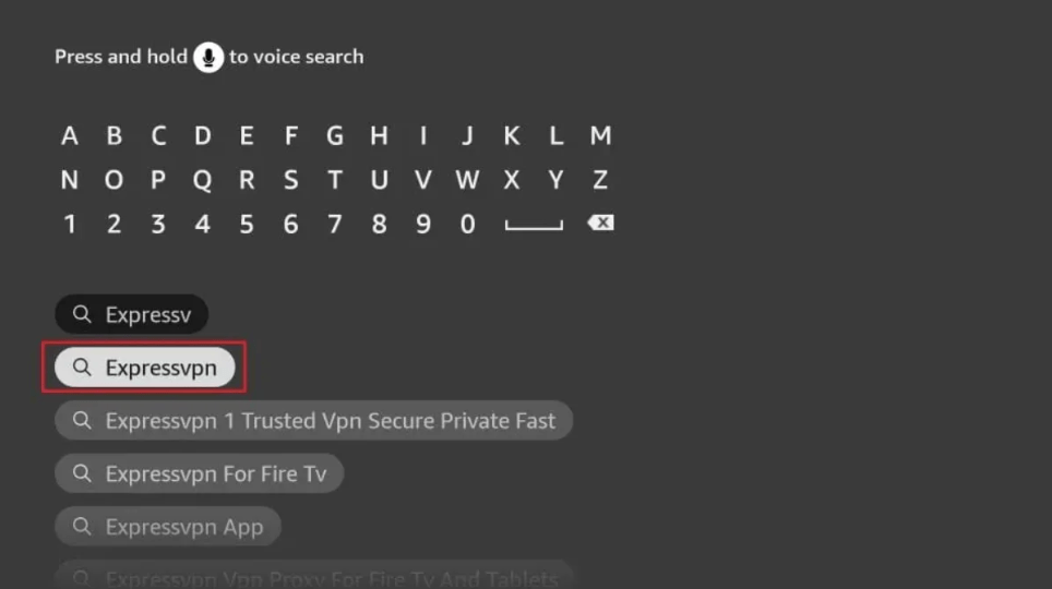 • Busque ExpressVPN: vaya al ícono de búsqueda (lupa) en la esquina superior izquierda de la pantalla de inicio de FireStick. Escriba “ExpressVPN” en la barra de búsqueda y selecciónelo de la lista. (Como se muestra en la imagen a continuación)