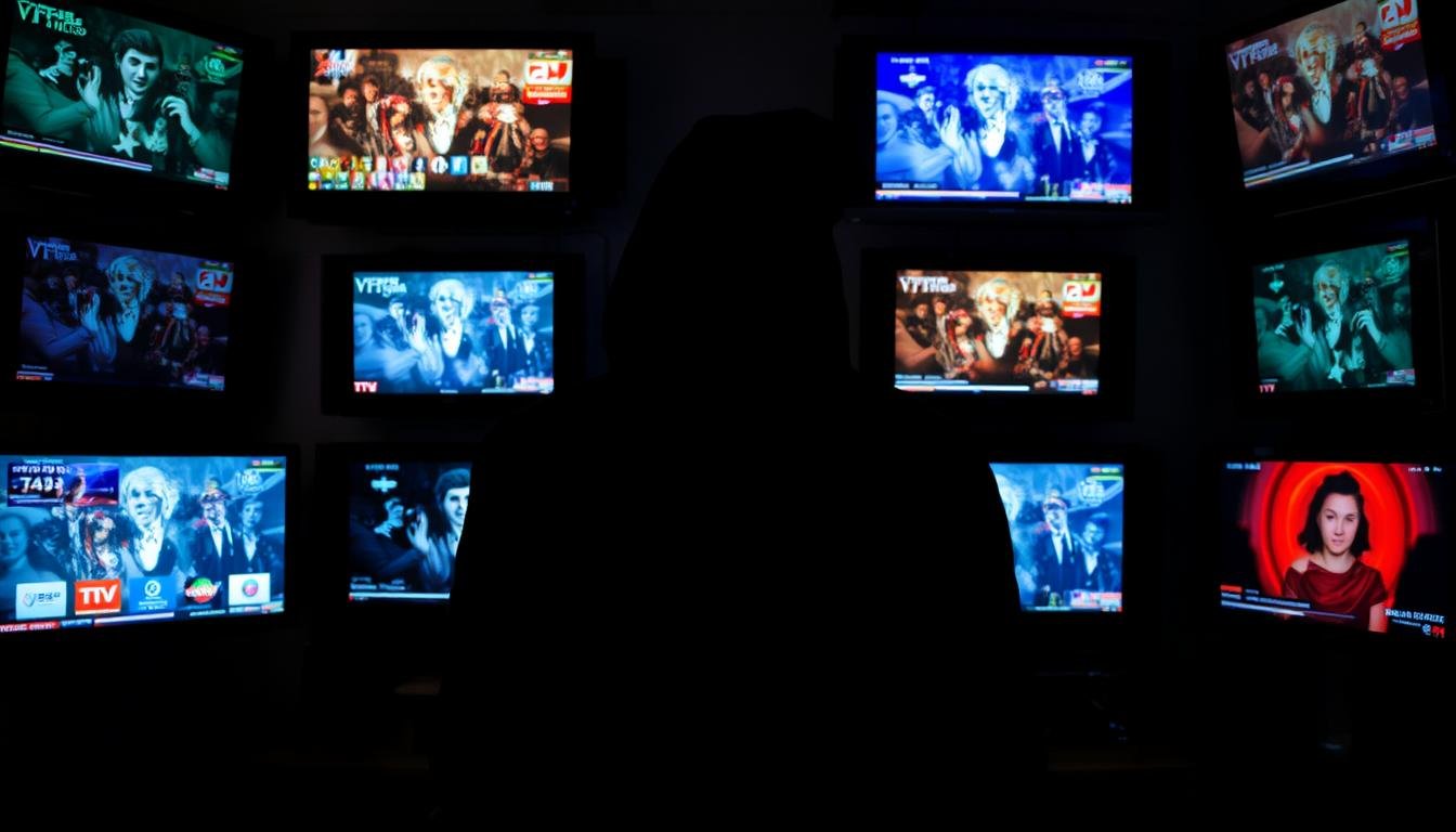 A shadowy figure sitting in front of multiple screens displaying various TV channels, surrounded by cables and unmarked devices, with a dimly lit room creating an atmosphere of secrecy and illicit activity, emphasizing the concept of illegal IPTV with ominous undertones.