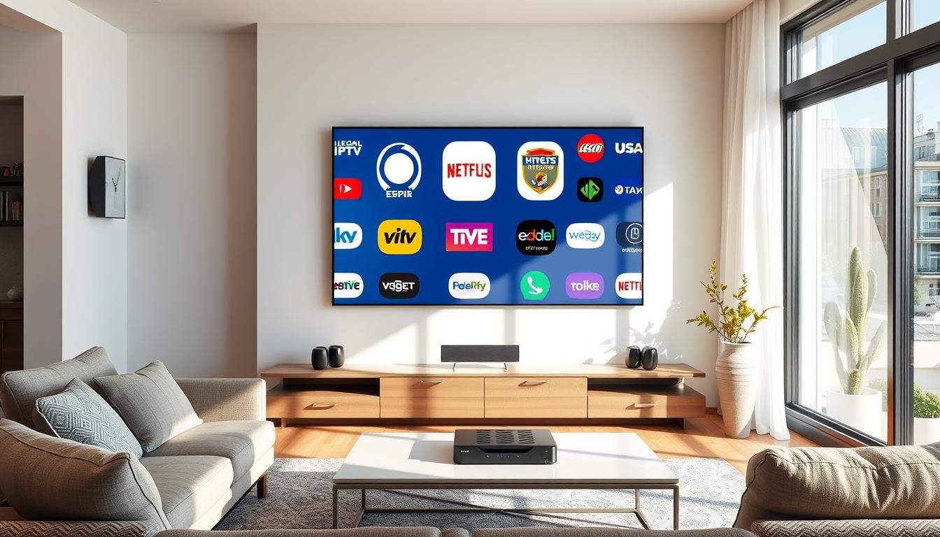 A modern living room with a large flat-screen TV displaying various legal IPTV logos, a cozy sofa, a streaming device on a sleek coffee table, and bright natural light streaming through the windows, creating an inviting atmosphere.